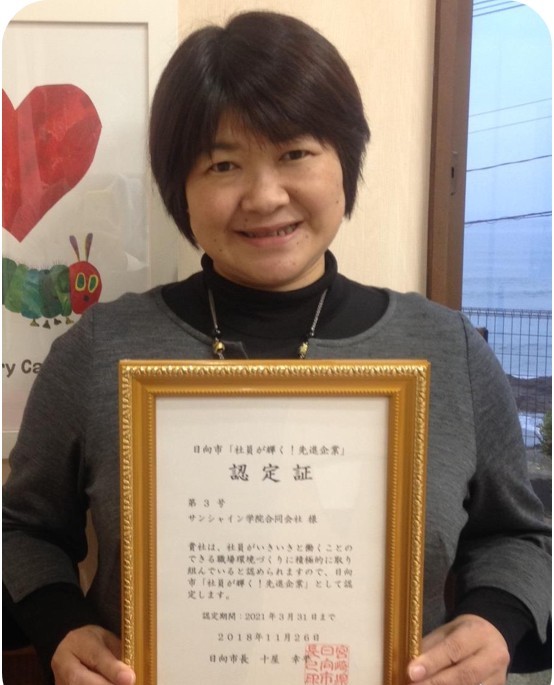 2018年11月 日向市「社員が輝く!先進企業」の認定をいただきました。これからもスタッフともども生徒さん達のために励むとともに、地域の国際化・活性化に貢献して参ります。